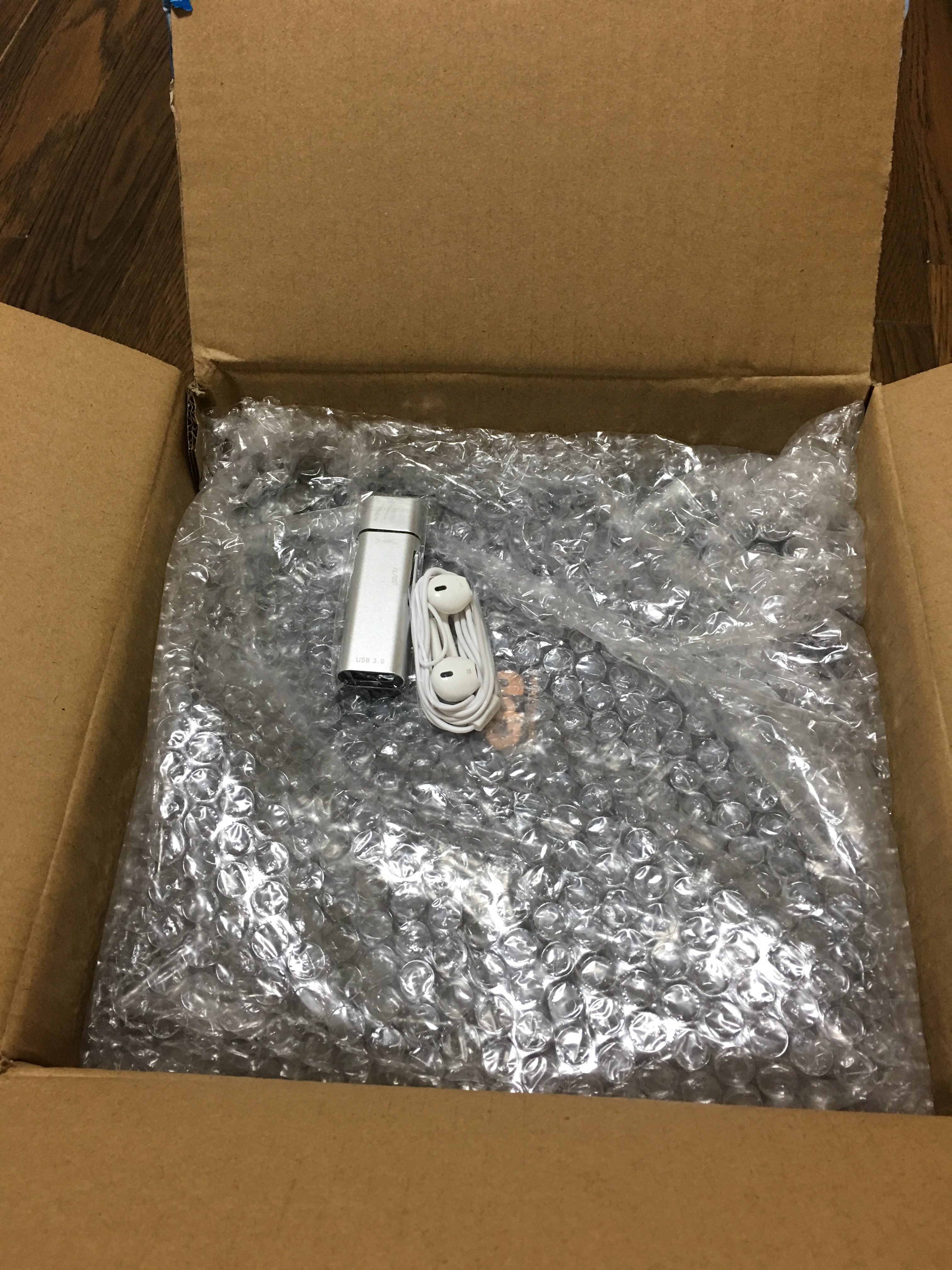 佐川の箱を開けたら、GPD Pocketの箱の前に梱包材の上にイヤホンとUSBハブが放り込んでありました。ハブは注文したものですがイヤホンはおまけでしょうか?