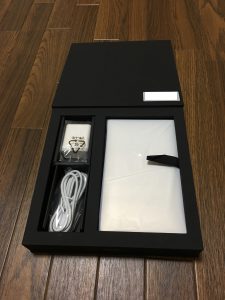 箱の中はこんな感じです。Macと違って、箱を開けたら黒い紙で覆われていていきなり製品とご対面、ではありませんでした。写真は覆う紙を外したものです。