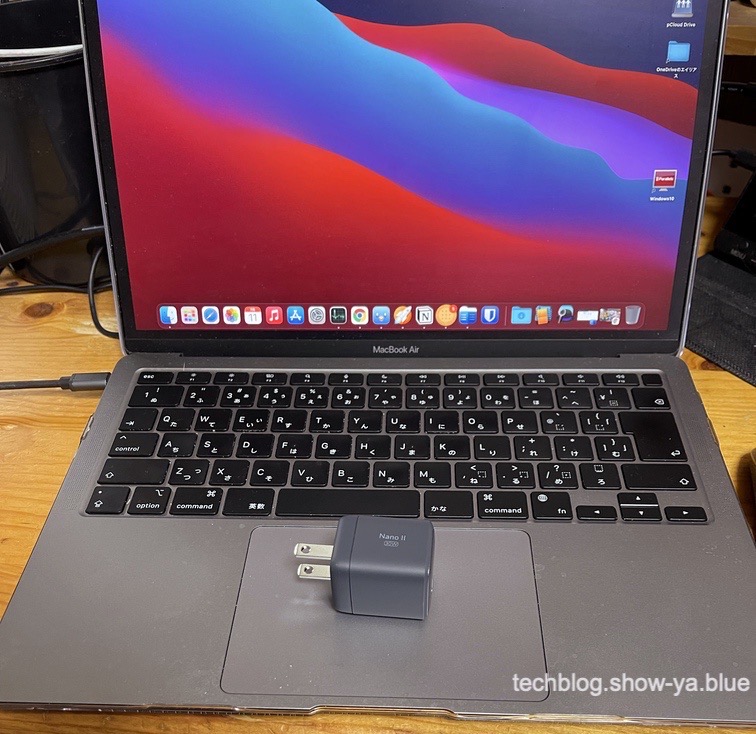 ほぼスマホ用の充電器と変わらないサイズなのにM1搭載MacBookAirをフルスペックで充電できるので素晴らしい性能ですし、素晴らしいサイズ感です。
