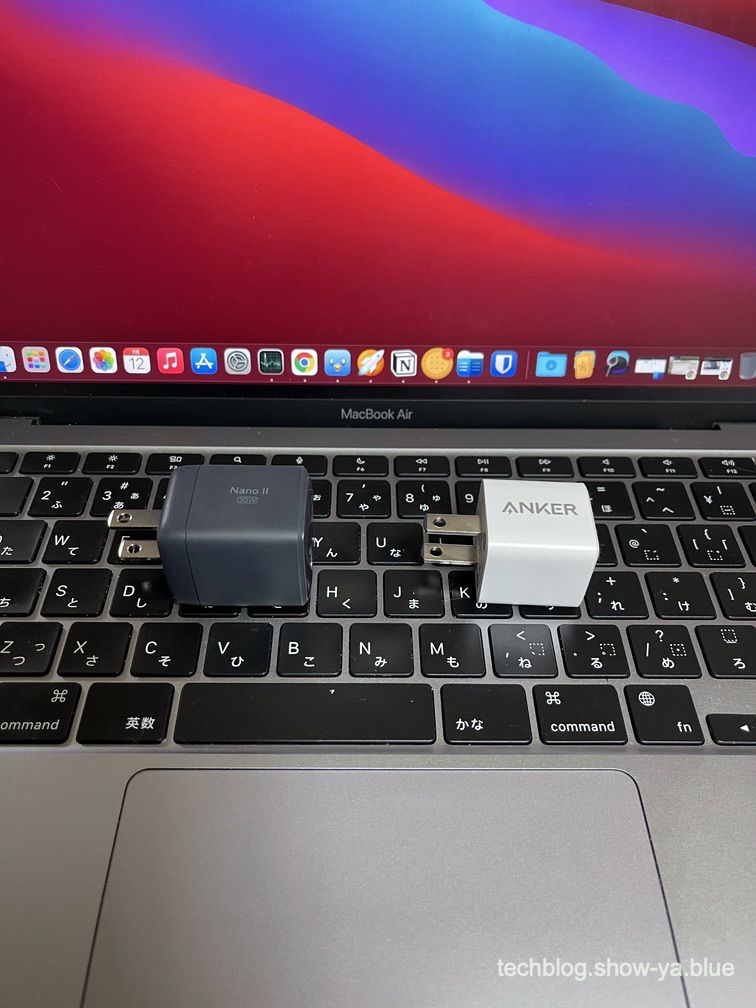 AnkerのGaNIIの30Wの充電器Anker Nano II 30WもApple純正のACアダプタに比べると4分の1以下のサイズなので持ち運びに便利で、旅行なんかに行くときは純正アダプタではなくこちらを持っていこうと思っています。