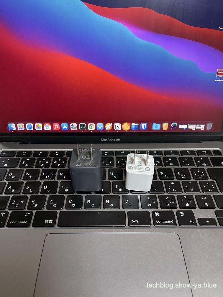 30Wという事はM1搭載MacBookAirを普通に充電できるスペックなのですが、信じられない事にAnkerの20Wの充電器をほんの1周り大きくしただけのサイズなのです。