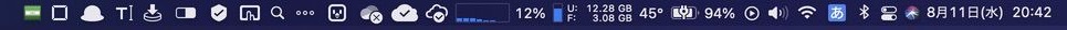 これは後でご紹介するBartenderというアプリを使ってアイコンの間を詰めており、色々なアプリを導入して使うにはBartenderを使うのは非常に良い方法なのでお薦めです。